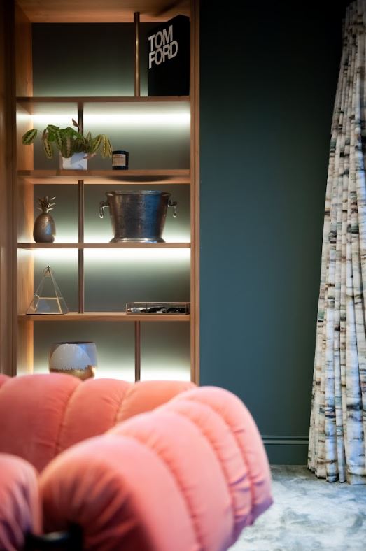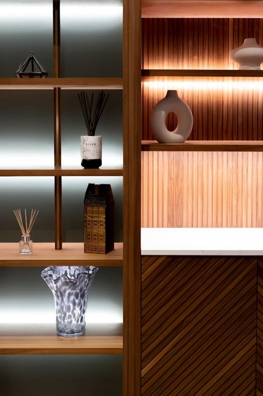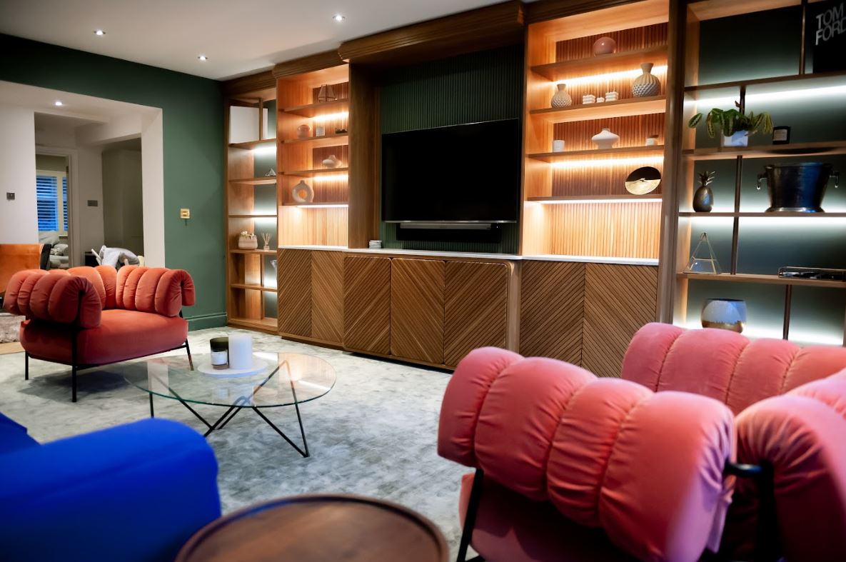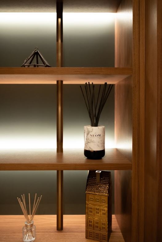 We created the cabinetry of this media unit in solid walnut wood with brass inlays and warm LED lighting, complete with walnut and brass supports for the open bookshelves.
